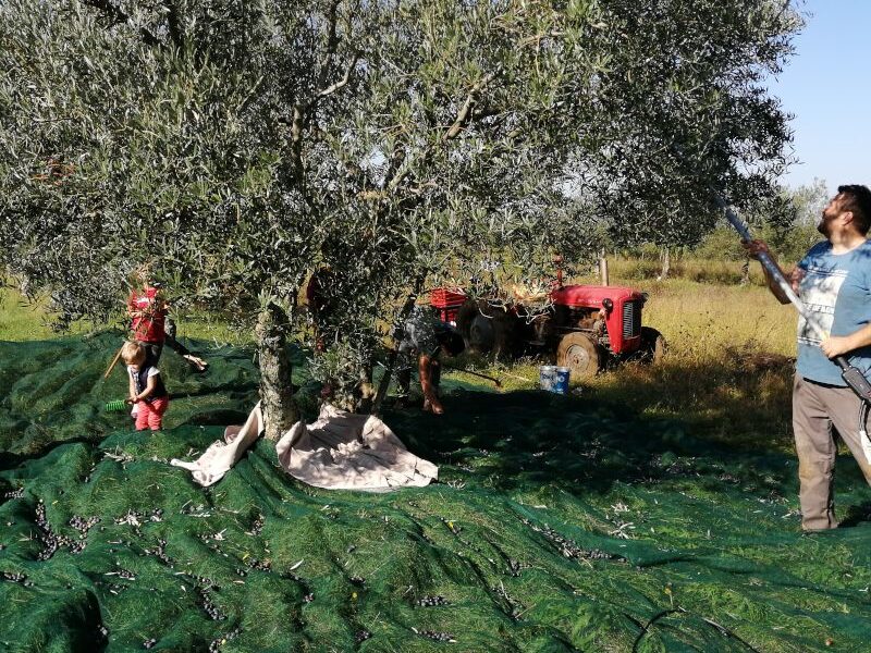 The olive grove has mostly olives of the Carbonaca variety, and a few trees of other varieties for better pollination and ecological protection from pests.